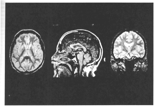 | MRI scans acquired in axial (A), coronal (B) and sagittal (C) planes. All images were acquired with a field of view of 24 cm, NEX = 1, and 256 x 256 matrix. Left: Axial image, 5-mm thick, passing through the lateral ventricles and basal ganglia. Image was acquired in an oblique plane parallel to the AC-PC line. Image was acquired using a spin-echo sequence, gated to achieve an effective TR of >2400 ms with one excitation for each of 256 phase encodes and TE of 20 ms. Center: Mid-sagittal image, 3 mm thick, acquired using a single-echo pulse sequence (TR=600 msec; TE=20 msec), collected without using internal anatomical landmarks. Image highlights the corpus callosum, brain stem and cerebellum. Right: Coronal image, 3 mm thick, passing through laeral ventricles and temporal lobes. Image was acquired in a plane perpendicular to the AC-PC line using a multiecho, flow compensated, cardiac gated pulse sequence (TE=40 msec; effective TR·2800 msec). |