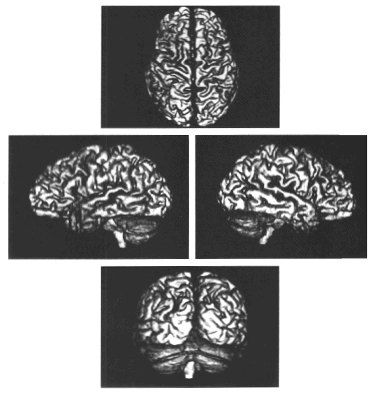 Three-dimensional renderings of MRI dataset presenting images of the brain as if viewed from above (top) left and right, and behind (bottom).