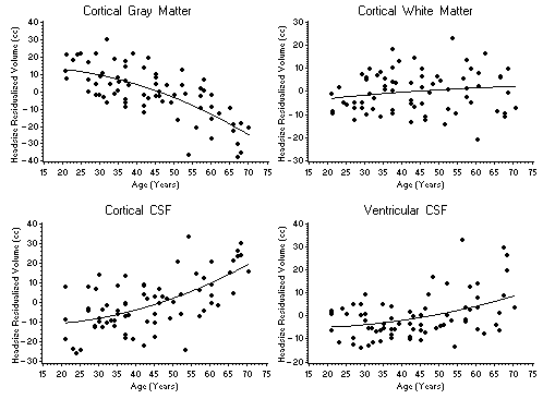Volumetric measurements of cortical gray matter, cortical white matter, cortical CSF and ventricular CSF from 73 healthy men, aged 21 to 70 years old plotted as a function of age. The regression line is a weighted constrained quadratic function. Weighting was used to take into account the heteroscedasticity (increased variance in older age) of the data. Brain measures (expressed in cc) were first regressed against an estimate of head size volume. Residual values were then calculated for each subject by subtracting their predicted score for each ROI, based on head size, from the observed score. Cortical gray matter volume showed an average decrease of 0.7 cc per year, whereas cortical white matter remained stable oacross the five decades. Cortical CSF increased 0.6 cc per year, and ventricular CSF 0.3 cc per year. |