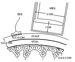 An EEG is most sensitive to a similarly oriented dipole layer in the gyri (ab, de, gh), less sensitive to a similarly oriented dipole layer in the sulcus (hi), and insensitive to an opposing dipole layer in sulci (bcd, efg) and to a random dipole layer (ijklm). A MEG is most sensitive to a similarly oriented dipole layer in the sulcus (hi) and much less sensitive to all others. The latest MEG sensors are smaller than the one shown. From Nunez (47). |