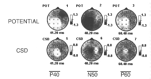 Potential (voltage) and current source density (CSD) maps of the somatosensory evoked response (SER) following left (lt) tibial nerve (N) stimulation. Data are based on averages of responses to 500 to 1,000 electrical stimuli delivered at a rate of 2.1/sec to a healthy man. Maps are given for P40, N50, and P60 components (P or N signify positive and negative, and the number is the mean peak latency in msec). Lighter shading is more positive. Note that localization of components is better in CSD maps than in potential maps. Adapted from Nagamine et al. (46). |
