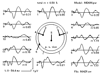 Coronal ERP scalp distribution to clicks in a 38-year-old man. He was presented with 2,000 trials of 70-dB HR right ear clicks at 60-msec intervals. On a head model viewed from the front are drawn the six dipoles that were found by modeling to account for the most variance in the most anatomically plausible way. From Scherg (63). |