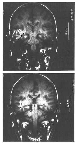 Coronal MRI tomogram of the subject whose data are presented in Figure 5. Locations of the current dipoles are marked by black dots at the tips of the arrows. From Pantev et al. (50).