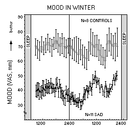 | Circadian rhythm of half-hourly self-ratings of mood (Visual Analogue Scale, VAS, mean ± sem): 0 mm = extremely depressed mood; 50 mm = euthymia; 100 mm = extremely good mood) throughout a total sleep deprivation during a 40-hr constant routine protocol (see ref. 74 . The subjects slept in the laboratory before and after the constant routine. The vertical line is anchored at midnight. Two groups of women were studied in winter, in the follicular phase of their menstrual cycle, when present: patients diagnosed as SAD, N = 11, aged 46.5 ± 3.9 years (Hamilton Depression Scale score = 13.9 ± 1.5) and matched nondepressed controls, N = 8, aged 50.4 ± 4.4 years. ANOVA for repeated measures was carried out using 1.5 hourly averages. This showed that (a) controls had higher mood ratings than SAD {F(1,17) = 58.6, p = 0.0001.}; (b) both groups showed a circadian rhythm {F(23,391) = 2.8, p = 0.0001.}; (c) the time course of mood change was different in the two groups. SAD showed a mood improvement with sleep deprivation, controls rather a decline: {interaction term F(23,391) = 1.7, p = 0.026.} (Wirz-Justice et al., unpublished data). |