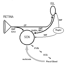 | Schematic representation of the major neural components of the mammalian circadian system (based on information in ref. 25). Light information is transduced by the retina and reaches the suprachiasmatic nuclei (SCN) directly via the retinohypothalamic tract (RHT), and indirectly via the optic tract (OT) to the intergeniculate leaflet (IGL), and then via the geniculohypothalamic tract (GHT) to the SCN. The raphé nuclei project to both the IGL and SCN. An important efferent pathway from the SCN leads to the paraventricular nucleus (PVN), and an important subparaventricular zone. This pathway projects to the intermediolateral nucleus of the spinal cord and passes to preganglionic adrenergic fibers of the sympathetic nervous system, and thus to the superior cervical ganglion (SCG) which provides final sympathetic input to the pineal gland. The hormonal feedback of melatonin on melatonin receptors in the SCN is indicated by the dotted line. Putative neurotransmitters for each neuronal tract are identified as: EAA, excitatory amino acids; NPY, neuropeptide Y; 5HT, serotonin; GABA, g-aminobutyric acid. |
