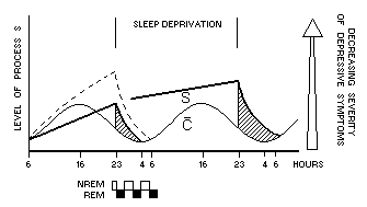The two-process model of sleep regulation and its application to depression and sleep deprivation response. Process C (the circadian pacemaker) and process S (the homeostatic component) in a healthy subject (dotted curve) and in a depressive patient (continuous curve) plotted for a regular sleep–wake cycle followed by total sleep deprivation. The sleep periods of the depressive patient are indicated by shading. Due to the deficiency of Process S, sleep propensity and the amount of slow-wave sleep are reduced, and the sleep period shortened. The deficiency of Process S leads to disinhibition of the REM sleep controlling process in the first part of sleep. Consequently, the latency to the first REM sleep periods is shortened and its duration increased (black and white rectangles represent the REM–non-REM cycles). Sleep deprivation normalizes not only the depressive sleep architecture, but induces a remission of depressive symptomatology (arrow on right ordinate). Reprinted with permission from ref. 5.