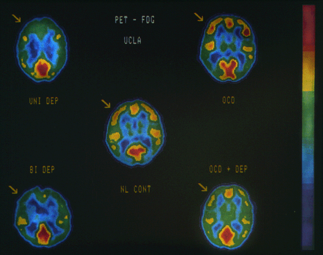 Positron emission tomographic scans demonstrating glucose metabolic rate of each area of brain, divided by that of whole brain (red>yellow>green>blue). Scans are from five middle-aged women and illustrate findings in left dorsal anterolateral prefrontal cortex (arrows). NL CONT indicates normal control; UNI DEP, unipolar depression; BI DEP, bipolar depression; OCC, obsessive-compulsive disorder without secondary major depression; and OCD+DEP, obsessive-compulsive disorder with secondary major depression. Depressed patients show similar reduced prefrontal metabolism. With permission from Baxter et al. 1989 (7). |