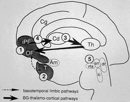 Possible mechanisms for common dysfunction of basotemporal limbic cortex in depression with three basal ganglia (BG) diseases, showing primary cell loss in frontal cortex; 1), remote changes in basotemporal limbic regions; 2), anterograde or retrograde disruption of BG-thalamo-cortical circuits from caudate degeneration or injury; 3,4), and degeneration of mesencephalic monoamine neurons and their cortical projections; 5), Note: Am = amygdala; Cd = caudate; Cg = anterior cingulate; dr = dorsal raphe; iPF = inferior prefrontal cortex; lc = locus coeruleus; OF = orbital frontal cortex; sn = substantia nigra; T = temporal cortex; Th = thalamus; vta = ventral tegmental area. With permission from Mayberg et al. 1992 (57). |
