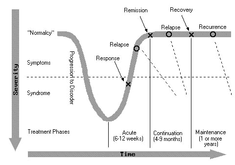 | Phases of unipolar depression. Adapted with permission from ref. 43 and reprinted from Depression in Primary Care: Detection, Diagnosis, and Treatment. Quick Reference Guide for Clinicians, Number 5, Agency for Health Care Policy and Research, AHCPR Publication No. 93-0552, 1993. |