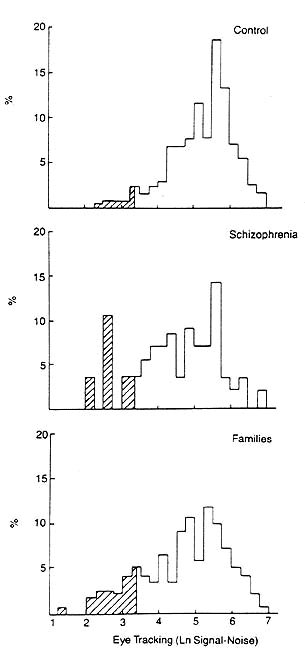 | The distribution of eye tracking measurements (log signal to noise ratio) in normals, schizophrenics, and their relatives. Normal (control) and schizophrenic data are normally distributed and the family data are bimodally distributed. (From ref. 12) |