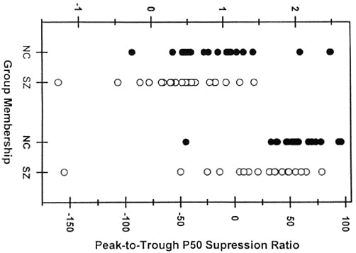 | Comparison of normals (NC) and schizophrenics (SZ) on the P50 auditory gating paradigm. The ratio of the decrease in the test wave amplitude to the conditioning wave amplitude (right) discriminated between the groups better than the difference between the waves (left). Other studies, e.g., Figure 8, used the ratio of the test to the condition wave; the value reported in this figure is equal to 1 minus the ratio of the test to the conditioning wave. (From ref. 22) |