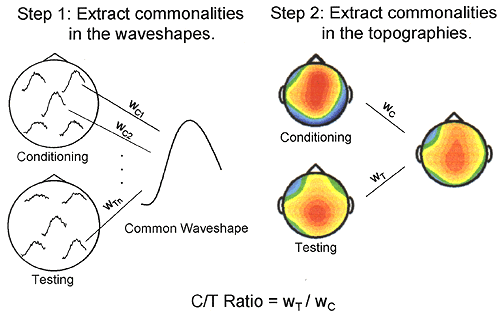 | The singular value decomposition method can be used to measure the P50 response in the conditioning-testing paradigm. In step 1, a common wave shape is extracted in both responses. This process generates a weight for each electrode for each condition reflecting the waveshape magnitude. In the second step, these weights are used to create topographies of both responses. A pair of weights is then extracted describing the amplitude of the two responses across a common topography. The ratio of these amplitude is the P50 ratio derived by the singular value decomposition method. Further description of the method is found in ref. 20, whose authors graciously supplied this figure. |
