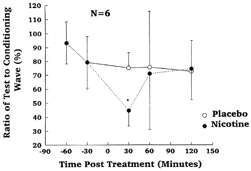 Double-blind comparison of the effect of nicotine (6 mg in gum) or placebo on the P50 ratio in the conditioning-testing paradigm. Asterisk indicates that the P50 ratio was significantly decreased immediately after administration of nicotine. (From ref. 2) |