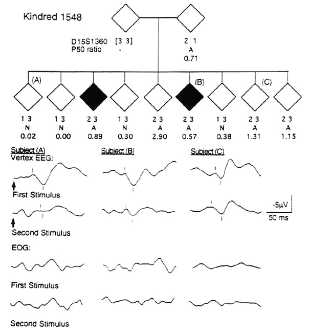 Genetic linkage of the alleles of D15S1360 and abnormal auditory sensory gating as measured by P50 in one portion of a family with schizophrenic probands. The pedigree has been altered to preserve confidentiality. The filled symbols are schizophrenics. P50 ratios are shown and coded A for abnormal (> 0.50) or N for normal (< 0.40). Abnormal P50 ratio and schizophrenia are both associated with allele 2 from the parent at right. Sample electroencephalographic (EEG) recordings are shown below, with the P50 indicated by computer-generated marks. The electro-oculographic (EOG) tracings demonstrate that the P50 is not contaminated by EOG artifact. (From ref. 37) |