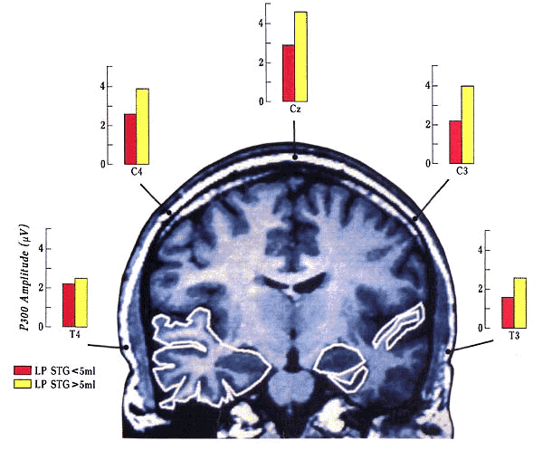 | Magnetic resonance image showing temporal lobe (outlined on left portion of figure) and hippocampus, superior temporal gyrus, and parahippocampal gyrus (outlined separately on right portion of figure). The P300 amplitudes have markedly decreased left temporal (T3) voltages in those subjects (shown in red) with lower superior temporal gyrus volumes. (From ref. 68) |
