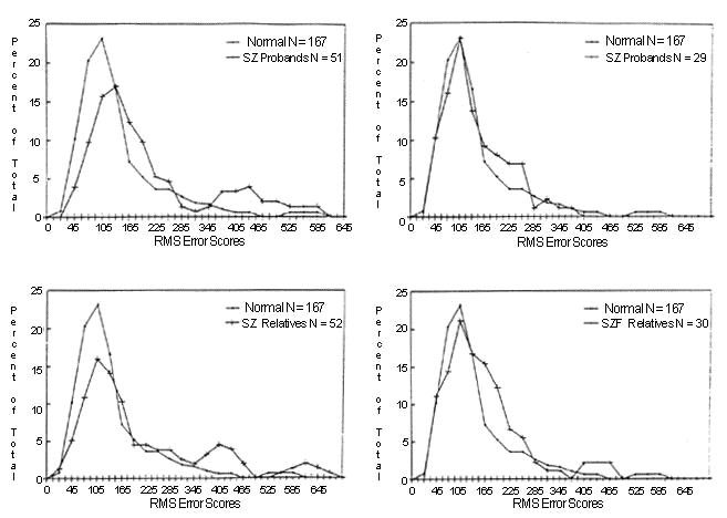 | Histogram of root mean square error measurements of eye tracking dysfunction in schizophrenic (SZ) and schizophreniform disorder (SZF) patients and their relatives, showing a small proportion of clearly abnormal scores in the patients and their relatives. (From ref. 53) |