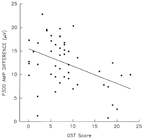 | Comparison of P300 amplitude and performance on the Goldstein-Scheerer Object Sorting Test (OST) in normal university students. Increased scores, representing allusive thinking, are correlated significantly with lower P300 amplitude. (From ref. 114) |