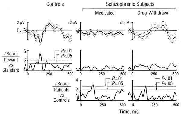 Significant differences in mismatch negativity, shown as a prominent wave at 200 msec in controls which is absent in medicated and drug-withdrawn schizophrenics. (From ref.