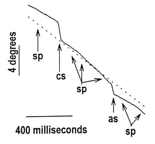 Various types of smooth pursuit tracking to a target (dotted line). From left top, the subject's tracking, shown by the solid line, has deviant smooth pursuit (sp with one arrow), which is corrected by a catchup saccade (cs). Tracking is normal (sp with three arrows), but then an anticipatory or leading saccade (as) causes it to deviate. Smooth pursuit (sp with two arrows) is then slowed so that the target can catch up to eye position. (From ref. 89) |