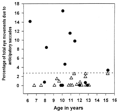 Anticipatory saccades, as a percentage of total eye movements, vs. age. Children of schizophrenic mothers (closed circles) are shown, as are a control group of normally developing children of normal parents (open triangles). The dotted line represents two standard deviations above the mean of the control group. Seven of the 13 children (or 54%) of schizophrenic mothers, compared with none of the control children, are above this value. (From ref. 89) |
