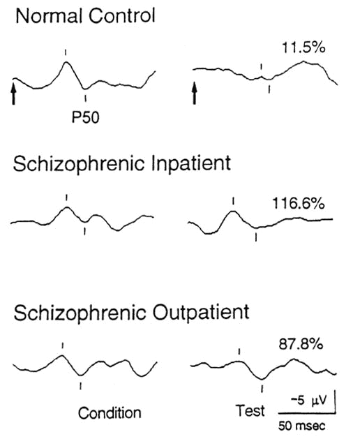 Auditory evoked potentials in response to paired stimuli (arrows). The P50 wave was detected and measured by a computer algorithm. The percentage above the second response is the ratio of the second or test amplitude to the first or conditioning amplitude. (From ref. 115) |