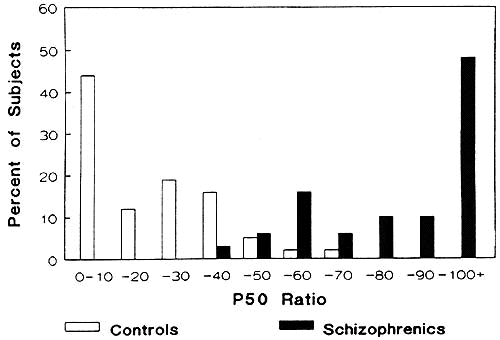 Histogram of the distribution of P50 ratios in normals and schizophrenics. A discriminant analysis found that values >40% correctly identified 97% of schizophrenics and excluded 91% of normals. (From ref. 112) |