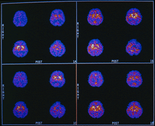 Escalating doses of haloperidol in a healthy volunteer. Each panel represent four slices within the basal ganglia, acquired on separate days. Top left, baseline placebo; top right, after the administration of 1 mg haloperidol; bottom left, after 2.5 mg; bottom right, after 5 mg. Note that the increased dose of haloperidol is associated with decreased specific activity in the basal ganglia, reflecting increased competition. (Illustration courtesy of Abass Alavi, MD, Hank Kung, PhD, and P David Mozley, MD, Department of Radiology, University of Pennsylvania) |