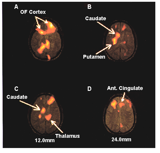 PET study measuring cerebral blood flow rates in eight OCD subjects exposed to a neutral stimulus, then with one designed to provoke obsessive thoughts and anxiety. Shown are omnibus subtraction images (summed for all subjects) with the provoked state minus the resting condition, displayed with a hot-iron scale in units of z scores, superimposed over a normal magnetic resonance image transformed to a standard brain, for the purpose of anatomic reference. Increasing z score indicates activity in the provoked state that is increased to levels above that in the resting state. Orbital cortex, bilaterally, and right head of caudate nucleus were a priori brain regions of interest, which showed significant (p < 0.01) changes (increases); other regions were significant at the trend level (p < 0.10). From Rausch et al. (60). |