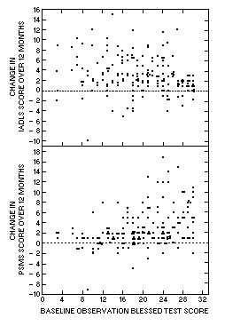 Annual change scores on the Instrumental Activities of Daily Living Scale (IADLS) and the Physical and Self-Maintenance Scale (PSMS) for Alzheimer patients in a longitudinal study. Change scores on both scales are shown for 172 annual follow-up periods with baseline scores on the Blessed Test of Information, Memory, and Concentration of less than 31. Where points overlap, approximate values have been graphed so that all points are visible. (From ref. 19, with permission. Copyright 1992, American Geriatrics Society.) |