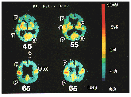 | PET scans of a severely demented AD patient. rCMRglc, derived with Scanditronix PC 1024-7B tomograph, in units of mg/100 g brain/min. Higher metabolic rates are retained in the primary sensorimotor cortex (sm), primary visual cortex (o), primary auditory cortex (a), and caudate and lenticular nuclei (c), but are reduced in association neocortices. P, parietal lobe; F, frontal cortex; T, temporal cortex; O, occipital cortex. Numbers represent millimeters above inferior orbitomeatal line. (Courtesy of Laboratory of Neurosciences, National Institute of Aging.) |