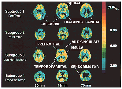 | PET scan images from four AD patients that best characterize four independent subgroups of metabolic patterns. Three planes are shown for each subject; left, at level of orbitofrontal cortex 30 mm above inferior orbitomeatal (IOM) line; middle, at level of basal ganglia 45 mm above IOM line; right, at level of centrum ovale 70 mm above IOM line. rCMRglc scale in mg/100 g/min. (From ref. 28.) |