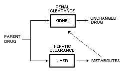 | Renal clearance and hepatic biotransformation are two possible mechanisms of drug clearance. When a drug undergoes renal clearance, a significant fraction of the dose is recovered in the urine in unchanged form. When a drug undergoes hepatic clearance, liver enzyme systems change the molecular structure of the parent compound. The metabolites produced by hepatic biotransformation often appear in the systemic circulation and are excreted by the kidney (dashed line), but this does not imply renal clearance of the parent drug. |