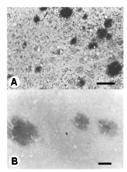 PrP cerebral amyloid plaques develop in the spontaneous neurodegenerative disease of transgenic mice which express a mouse PrP gene mimicking the codon 102 mutation genetically linked to human ataxic GSS, Tg (MoPrP-P102L)-174 mice (Hsiao et al., in preparation). Most of the amyloid plaques were located in the caudate nucleus but also occurred in the hippocampus and cerebellar cortex. A: Multiple amyloid plaques in the caudate nucleus. Bar represents 100 mm. Periodic acid–Schiff stain. B: Amyloid plaques in the caudate nucleus react specifically with PrP antibodies (R073). Peroxidase immunohistochemistry following proteinase K digestion. Bar represents 50 mm. |