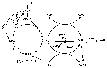 Glutamate metabolism in brain and its relationship to the operation of the tricarboxylic acid (TCA) cycle. CO2 indicates reactions in which CO2 can be fixed to pyruvate to yield malate (MAL) or oxaloacetate (OAA) for replenishing a-ketoglutarate exported for de novo synthesis of glutamate (GLU) (anaplerotic reactions). AcCoA, acetyl CoA; ASP, aspartate; CIT, citrate; FUM, fumarate; GDH, glutamate dehydrogenase; GLN, glutamine; SSA, succinic semialdehyde; SUC, succinate. |