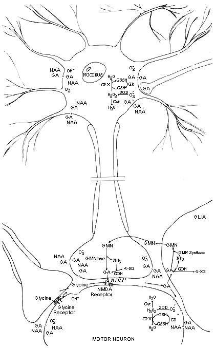 Diagram showing a hypothetical glutamatergic corticospinal neuron forming a synapse with a hypothetical motor neuron. In primates, corticospinal fibers, originating from motor cortex areas, can form direct connections with spinal cord motor neurons, particularly with those innervating distal muscles of the extremities (26). Glutamate (GA) released from the glutamatergic terminal during neurotransmission is thought to bind to postsynaptic receptors, one of which, the N-methyl-D-aspartate (NMDA) receptor, is shown schematically. The NMDA receptor mediates excitatory transmission by activating the Na+ channel, which is also highly permeable to Ca2+. Synaptic glutamate is inactivated by uptake, primarily into the surrounding astrocytes (GLIA) where it can be converted to glutamine (GMN) via glutamine synthase or be metabolized to a-ketoglutarate (a-KG) via glutamate dehydrogenase (GDH) or via glutamate oxaloacetate transaminase. Astrocytes may then supply the nerve terminal by glutamine and/or a-KG, both of which can serve as precursors of transmitter glutamate (66). Glycinergic interneurons are also known to innervate motor neurons. Glycine, present at high concentrations in the vicinity of the NMDA receptor, is expected to potentiate glutamatergic transmission by acting on a strychine-insensitive allosteric site of the NMDA receptor. Glycine seems to increase the frequency of the NMDA receptor channel openings by accelerating the recovery of the receptor from glutamate-induced desensitization. There are indications that in primary (sporadic) ALS, intracellular glutamate stores are depleted and extracellular levels are increased. A number of primary defects, capable of causing increased membrane permeability with resultant leakage of glutamate, NAA, and other compounds to the extracellular space, may be operational. Patients with familial ALS have mutations of Cu/Zn SOD, a cytosolic enzyme involved in the elimination of superoxide radicals (O -) produced intracellularly during certain oxidation reactions. Non-detoxified O -2 may cause lipid peroxidation with resultant increased membrane permeability. Leakage of glutamate to the extracellular space is expected to enhance excitatory transmission mediated by glutamate receptors. Under such conditions of increased synaptic glutamate, desensitization of the NMDA receptor may be essential for protecting postsynaptic neurons from excitotoxic damage. However, the presence of high levels of glycine in the spinal cord and brainstem may prevent these adaptive processes, leading to abnormal potentiation of excitatory transmission and selective degeneration of motor neurons. a-KG, a-ketoglutarate; Cat, catalase; GA, glutamate; GDH, glutamate dehydrogenase; GMN, glutamine; GMNase, glutaminase; GPX, glutathione peroxidase; GR, glutathione reductase; GSH, reduced glutathione; GSSG, oxidized glutathione; NAA, N-acetylaspartate; SOD, superoxide dismutase. |