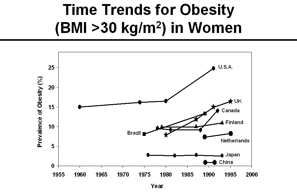 Time trends in prevalence of obesity in several countries (Adapted from WHO (105)).
