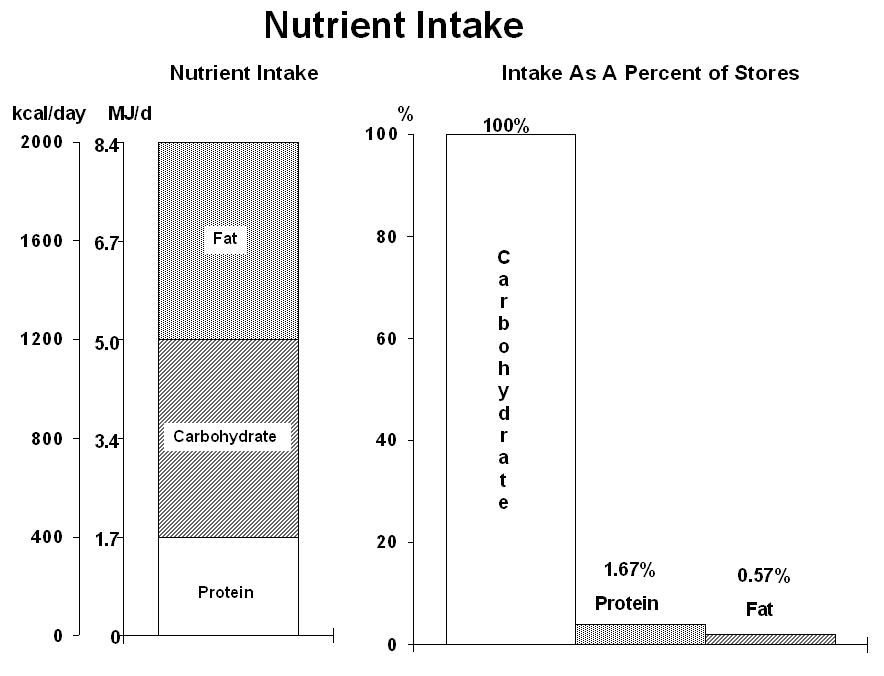 Relationship of macronutrient intake to body stores of that macronutrient. A diet containing 40% fat, 40% carbohydrate and 20% protein in terms of energy content is shown on the left. The relationship of each of these components to the body stores of the corresponding nutrient is shown on the left side as a percent of nutrient stores. |