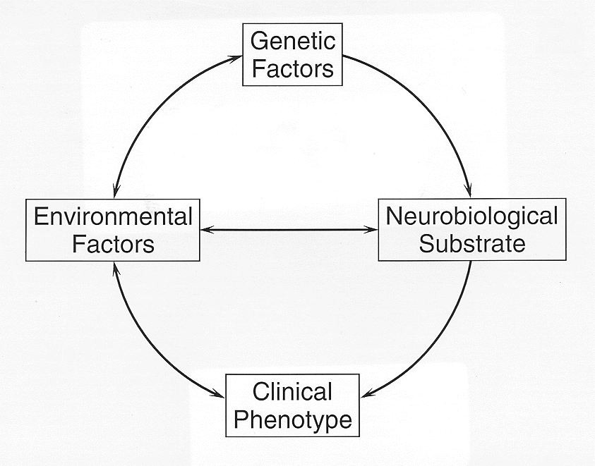 Pathogenesis of Tic Disorders. This figure depicts the interactions among genetic vulnerability factors and epigenetic events as they constrain the development of relevant neurobiological systems and ultimately lead to the expression of specific clinical phenotypes (50,59). The genetic vulnerability factor(s) that underlie Tourette's syndrome (TS) and other tic disorders likely influence the structure and function of the developing brain as well as the brain’s susceptibility to post-infectious autoimmune injury. Other epigenetic factors that likely influence the expression of the TS diathesis include transient cerebral hypoxia during labor and delivery and chronic psychosocial stress. |