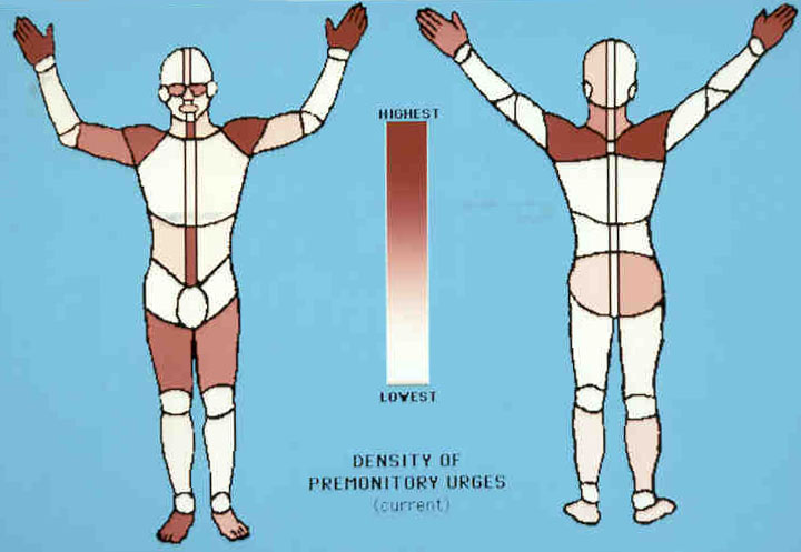 Density of Premonitory Urges. The densities of premonitory urges for each of 89 anatomical regions are depicted. The highest density on the scale represents 0.40 total premonitory urges per region per person, the lowest (0 urges per region per person), and the midpoint (0 .20 urges per region per person). Data based on any premonitory urges currently being experienced as assessed by self-report (N = 143). See ref. 64 for details. |