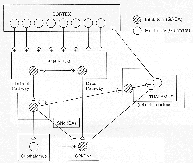 Basal Ganglia - Direct and Indirect Pathways. This diagram depicts the basic circuitry of the basal ganglia and the related CSTC circuits emphasizing the roles of the "direct" and "indirect" pathways in modulating the activity of thalamo-cortical projections (adapted from ref. 61). The role of nigrostriatal dopamine projections in mediating the output of the basal ganglia appears to depend on the balance of D1 vs. D2 dopamine receptor stimulation in the striatum. Indeed the stimulation of D1 and D2 receptors produce opposing effects in both rodents (32) and primates (28, 29). |