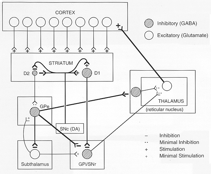 The Hypothesized Abnormalities in CSTC circuitry associated with the TS. We hypothesize that the symptoms of TS and related disorders are the result of a selective disinhibition of subsets of thalamocortical projections. This disinhibition is the product of one or more of mechanisms (dopaminergic hyperinnervation of the striatum, increased D2 receptor sensitivity, reduced activity of the subthalamic nucleus) leading to an imbalance in the direct and indirect pathways (see text and ref. 60). Not depicted in this figure are the important interactions among the sensorimotor, associative, and limbic CSTC circuits. Nor does it present the importance of relative activation of left versus right CSTC circuits or the cerebellar inputs to the thalamus. |