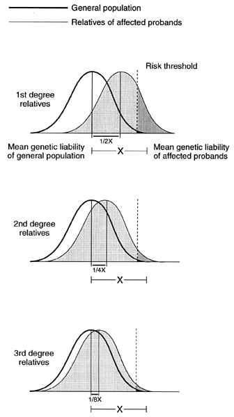 Genetic liability among first, second, and third degree relatives. "X" denotes mean differences in genetic liability between affected and individuals in the general population. (Altered from "Population genetics and multifactorial inheritances." In: Gelehrter TD, Collins FS, eds. Principles in medical genetics. Baltimore: Williams and Wilkins, 1990;49-65.) |