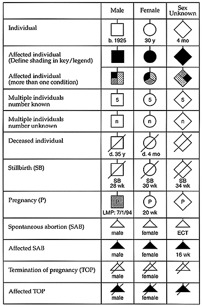 Common pedigree symbols, definitions, and abbreviations. (Reprinted with permission. Bennett R. The genetic family history in primary care.
