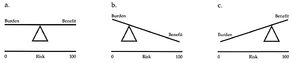 Place fulcrum at degree of risk. b. Low risk situation, benefits outweigh burdens. c. High risk situation, burdens outweigh benefits. |