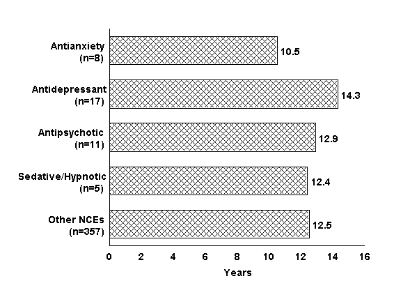 Mean time from synthesis of a compound to NDA approval for psychotropic and other NCEs approved in the United States during 1963 to 1997.