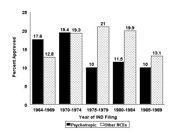 Clinical success rates for self-originated (i.e., discovered and developed by the same firm) NCEs by period of IND filing. A clinical success rate is the percentage of NCEs with INDs filed in a period that obtained U.S. marketing approval as of October 31, 1998. |