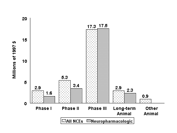 Mean phase costs for investigational self-originated NCEs (7). Data are for a sample of NCEs that first entered clinical testing anywhere in the world during 1970 to 1982. The all category results are for the full sample of 93 NCEs. Animal costs were incurred during the clinical period. Other animal costs are for animal testing that firms did not classify as long-term carcinogenicity or teratogenicity testing. |