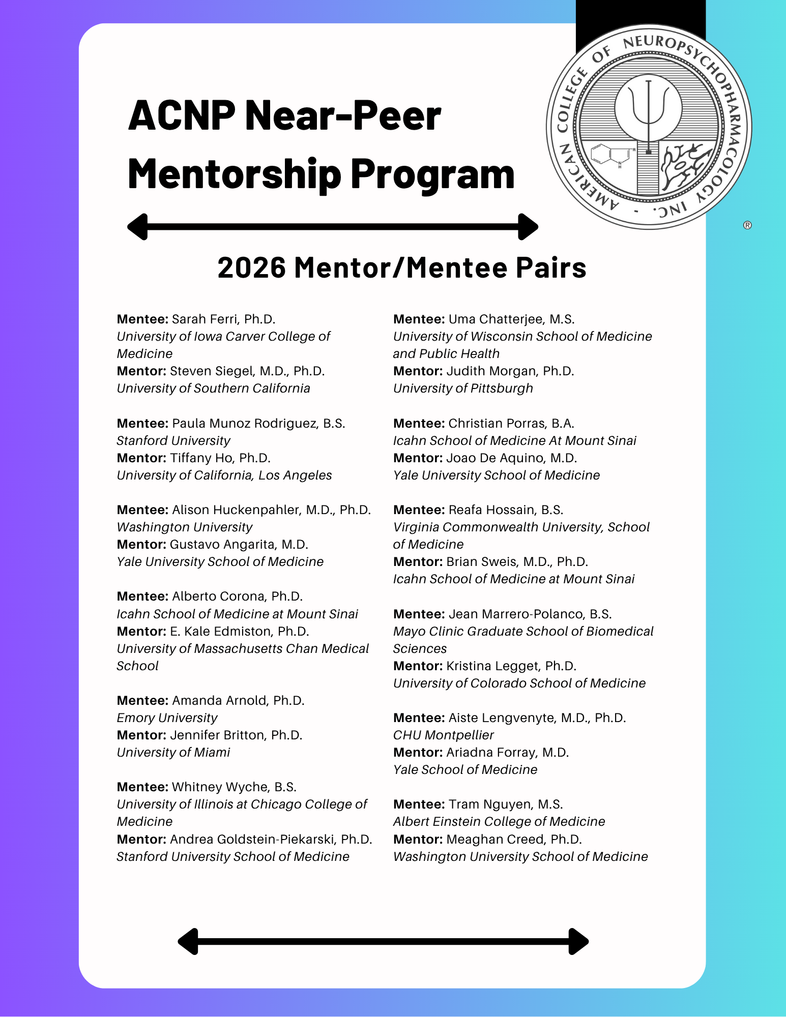 If you are interested in learning more about the program or in applying, either as a mentee or a mentor, please contact the ACNP Executive Office (acnp@acnp.org) or visit the Near-Peer Mentorship Program poster during the poster sessions at the ACNP Annual Meeting.